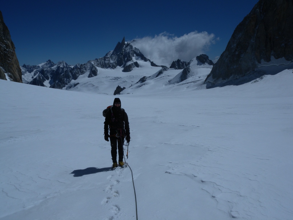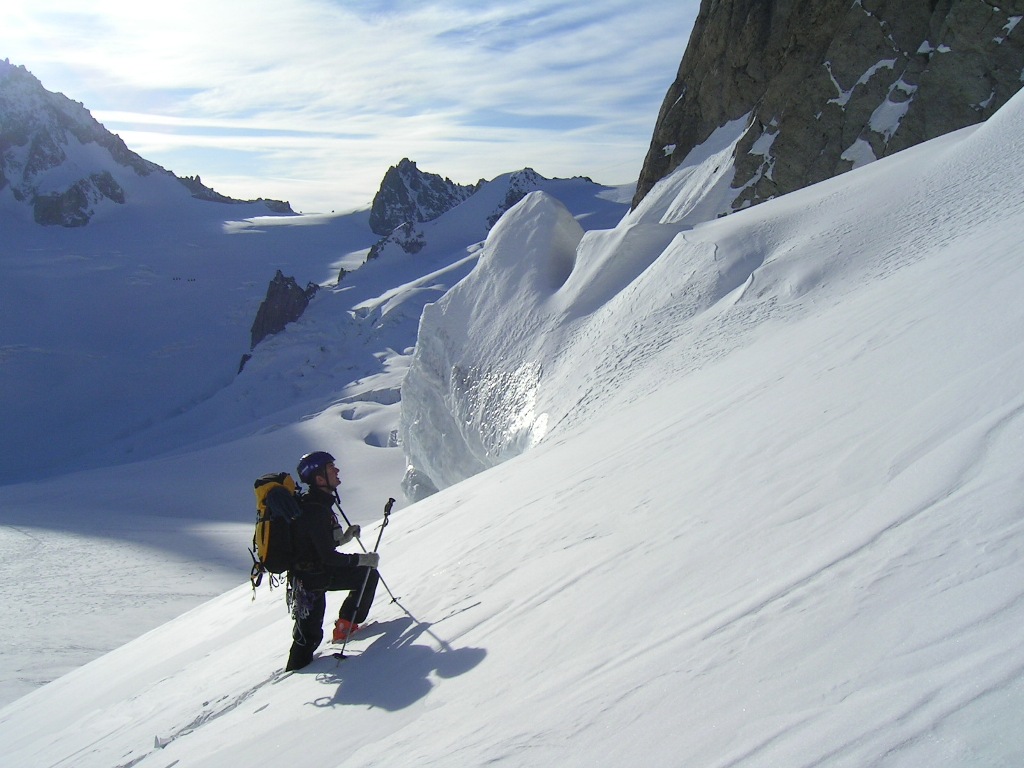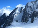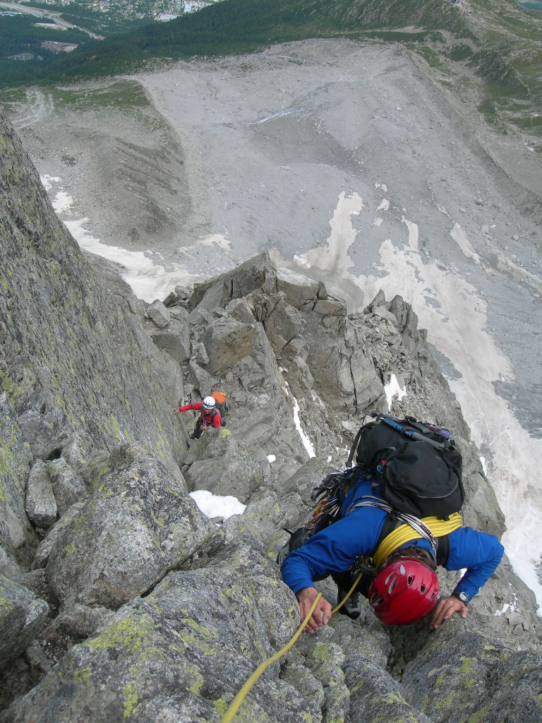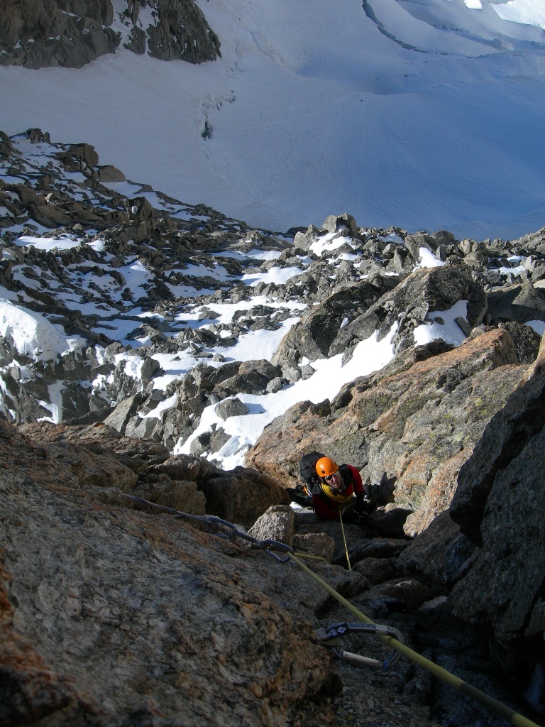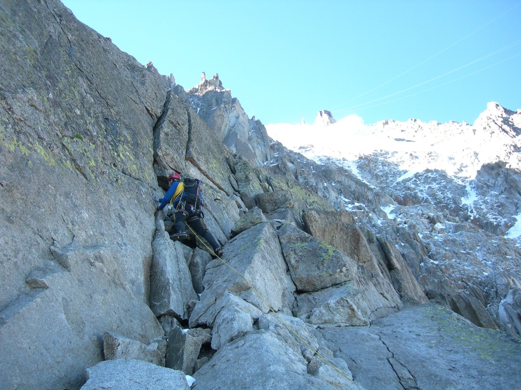 Informazioni: Una bella cima situata nel Gruppo del Bianco, un magnifico belvedere tra l'Aiguille Verte e le Grandes Jorasses. Dalla stazione di Montenvers in 3h al Rif du Couvercle passando per la bella ma faticosa ferrata. Partiti alle 5.00 si attraversa il ghiacciaio e si giunge all'attacco in prossimità della breccia squadrata della cresta. Si sale un camino (III) quindi per scalata su roccia ottima ma esposta si resta sulla cresta (IV) fino ad una tavola rocciosa evidente, quindi si continua in cresta con difficoltà sempre sul IV fino al gendarme dove si scende in doppia con pendolo. Al gendarme a forma di pan di zucchero, seguendo la relazione siamo passati sul lato sx in cerca della fessura di IV+ con masso incastrato ma ci siamo ritrovati in piena parete (e non era un IV+ ma credo un VII- e per di più sporchissimo). Dopo 2h di chiodature varie riusciamo ad uscire in cresta dopo i gendarmi monolitici Quindi senza difficoltà stando sul lato sx e in cresta fino al gendarme con la testa da martello da dove sale la normale. Percorsa la cengia nevosa siamo arrivati alla fessura fino quasi alla cresta. Qui ci ha sorpresi un temporale violento con grandine che ha ricoperto le rocce. Ci siamo riparati come potevamo e non appena ha un po' smesso siamo ritornati indietro alla cengia e quindi ci siamo calati sulle doppie della via classica della parete S (molti cordini qui e là).