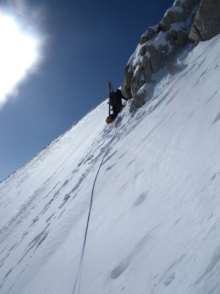 attraverso una cresta ripida nevosa con un ultimo tratto di roccette e