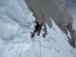 bello su ghiaccio sottile e roccia marcia (IV, 70°). Stando lungo la costola