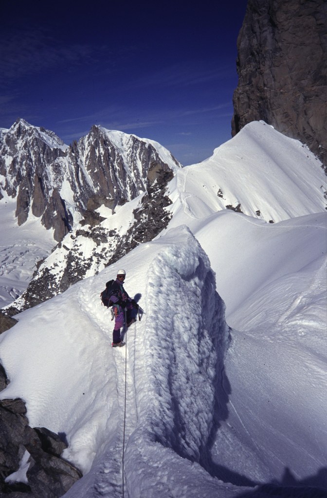 rifugio. Scendere per neve e ghiaccio la cresta affilatissima ed aerea (fiducia